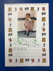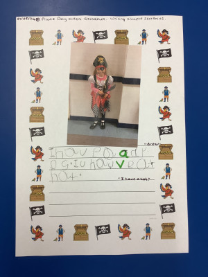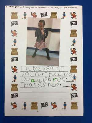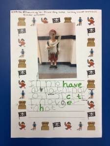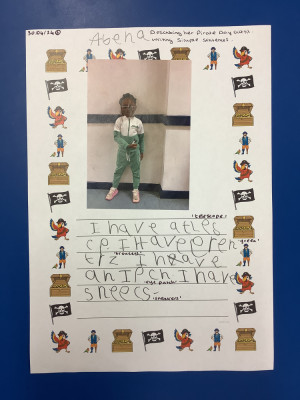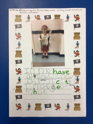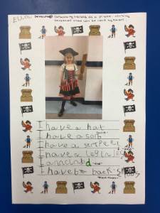 We wrote sentences about our characters from 'Pirate Day'. We described what we were wearing.